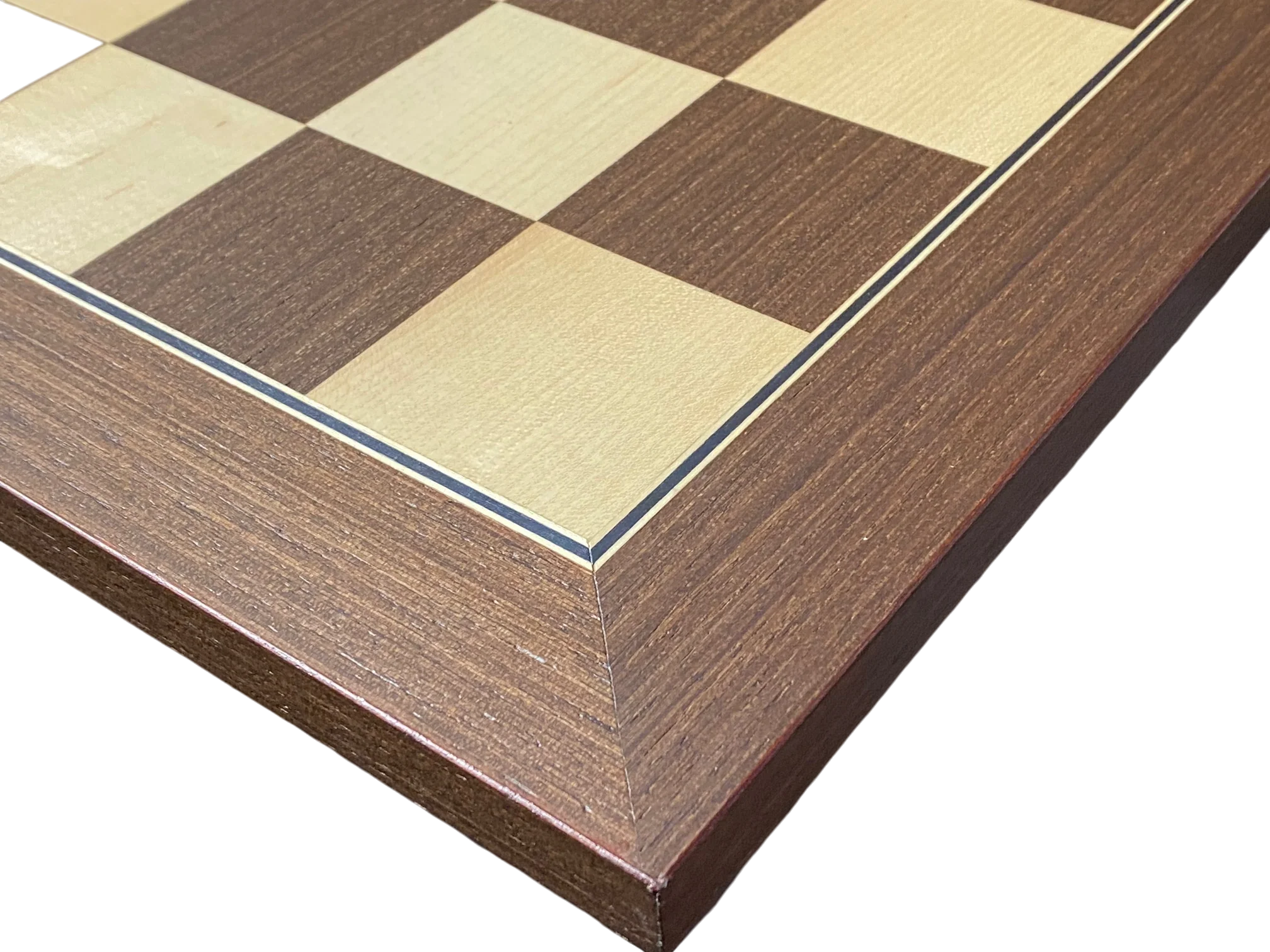 This exceptional 52cm chessboard showcases masterful craftsmanship with its striking combination of wenge and maple inlaid veneer woods. Each of the 55mm squares is meticulously cut and arranged to create a visually stunning playing surface, while the integrated delimiter frame adds both structural integrity and aesthetic refinement.