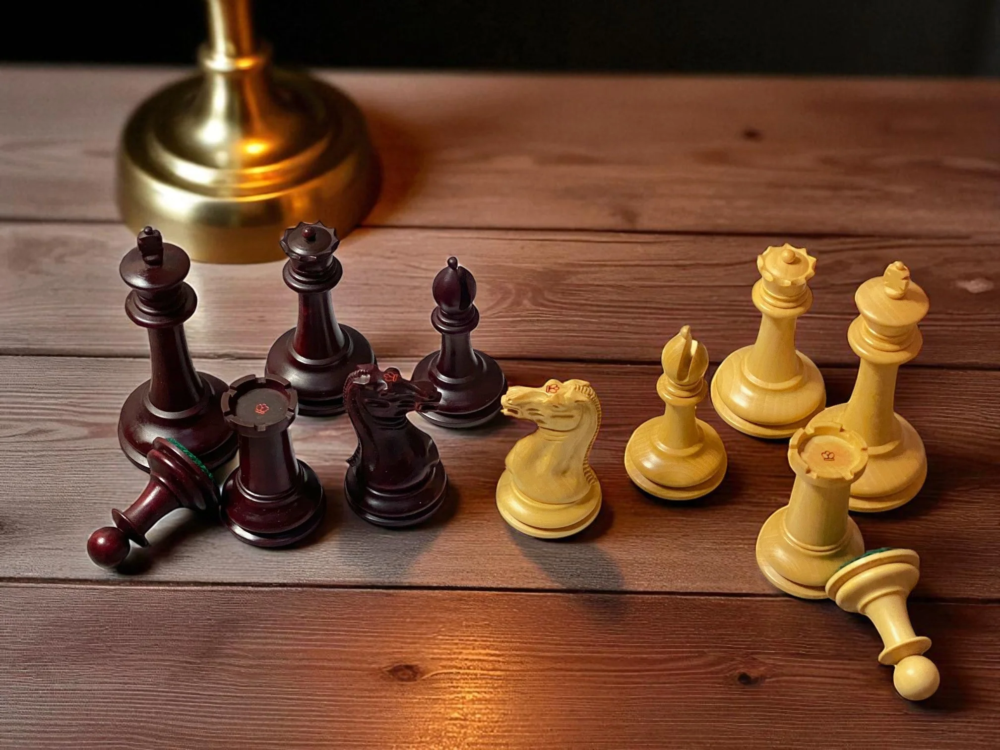 This set reproduces the iconic 1849 Cooke model from London, reflecting the style endorsed by the renowned British chess master Howard Staunton. Made from quality boxwood, each piece follows traditional romantic era specifications, featuring weighted bases and felt pads to ensure stability and smooth movement on the board.
