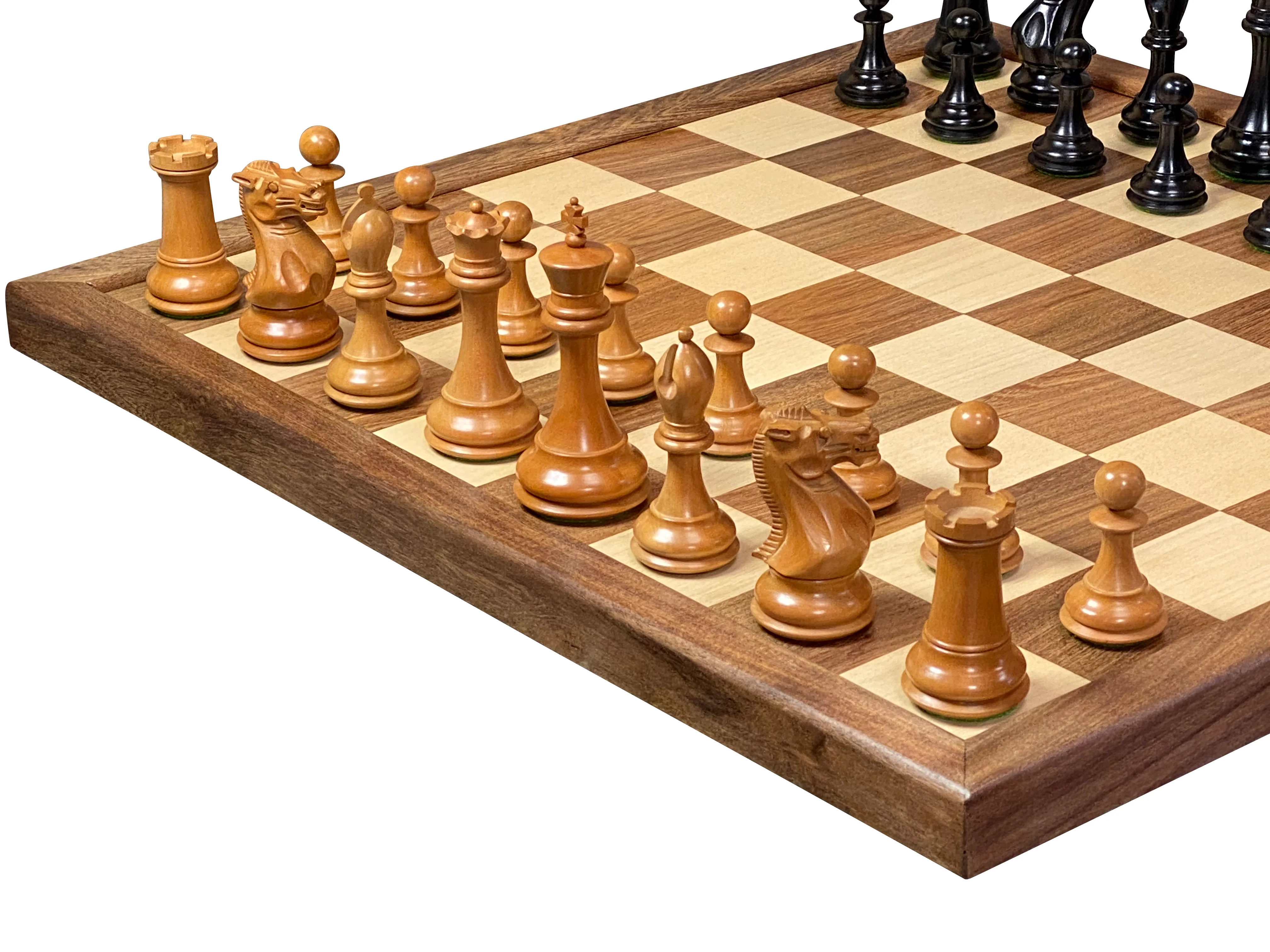 The Staunton Antique Collector is a beautifully handcrafted chess set, combining tradition, craftsmanship, and timeless style. Featuring the classic Staunton pattern, each piece is finished with an expertly applied antique patina for an authentic, historic look. The pieces are core-weighted and felted for superior playability, with a commanding 4-inch king that stands out on the large 21-inch solid wood chessboard. A mahogany storage box is included for secure and elegant piece storage.